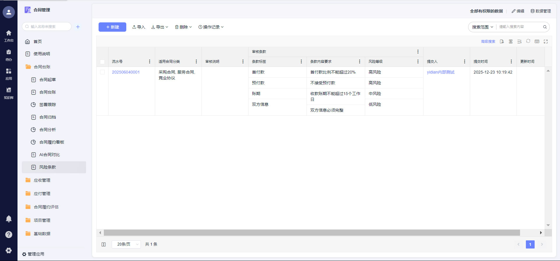 系统自动提取合同中的付款日期、交付节点、服务期限等信息,生成履约计划,通过短信推送等方式提前提醒负责人。同时对接ERP、CRM等系统,实时同步履约数据,比如交货进度、付款状态,一旦出现异常(如逾期未付款、交付延迟),系统自动发出风险预警,支持自定义预警规则,确保应收无逾期、应付不多付。