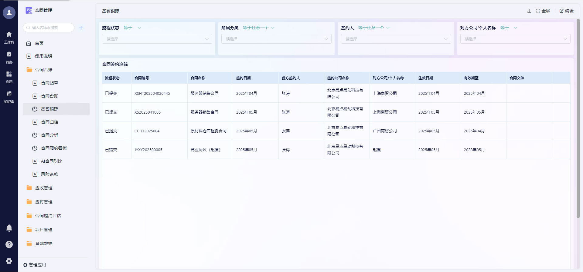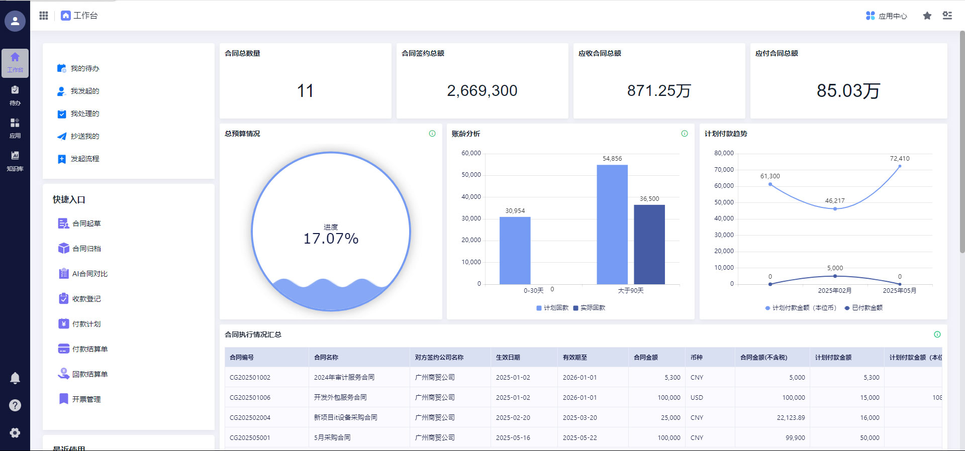 系统内置合同数据驾驶舱,自动汇总合同数量、金额、履约率、风险率、收付款情况等数据,生成几十套标准化报表,支持数据可视化展示。用户可在5分钟内创建自定义仪表板,按需筛选分析维度,还能依据历史数据预测收入、评估合作方信用。