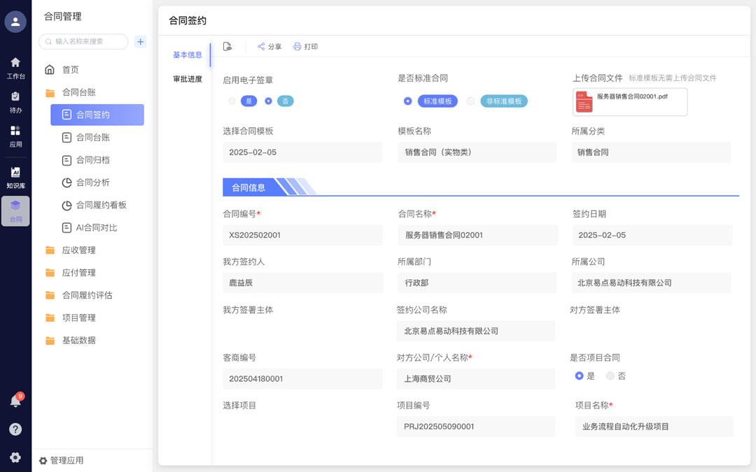 - 履约环节:自动监控关键节点,提前分级提醒,对接业务系统同步进度,异常及时预警,形成管理闭环;