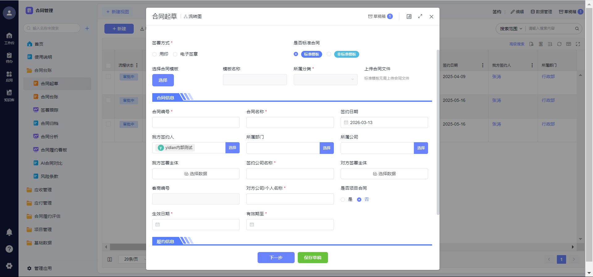 - AI智能起草:输入合作方、金额、履约周期等关键信息,几分钟生成合规合同初稿,自动匹配行业条款规范,减少人工构思成本。