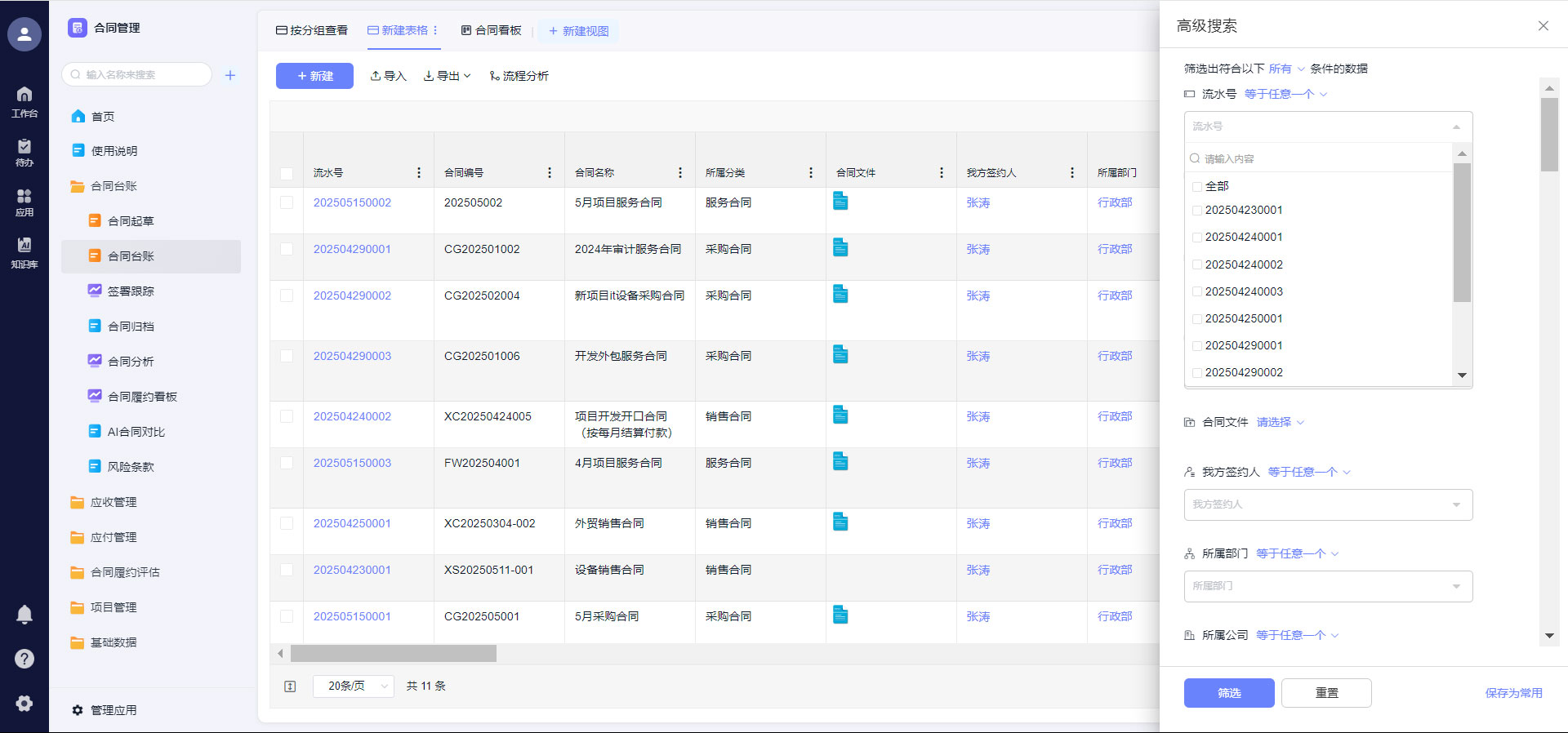 - 多维度检索:支持关键词、合同编号、合作方、金额等多条件检索,输入关键词,秒级定位目标合同。