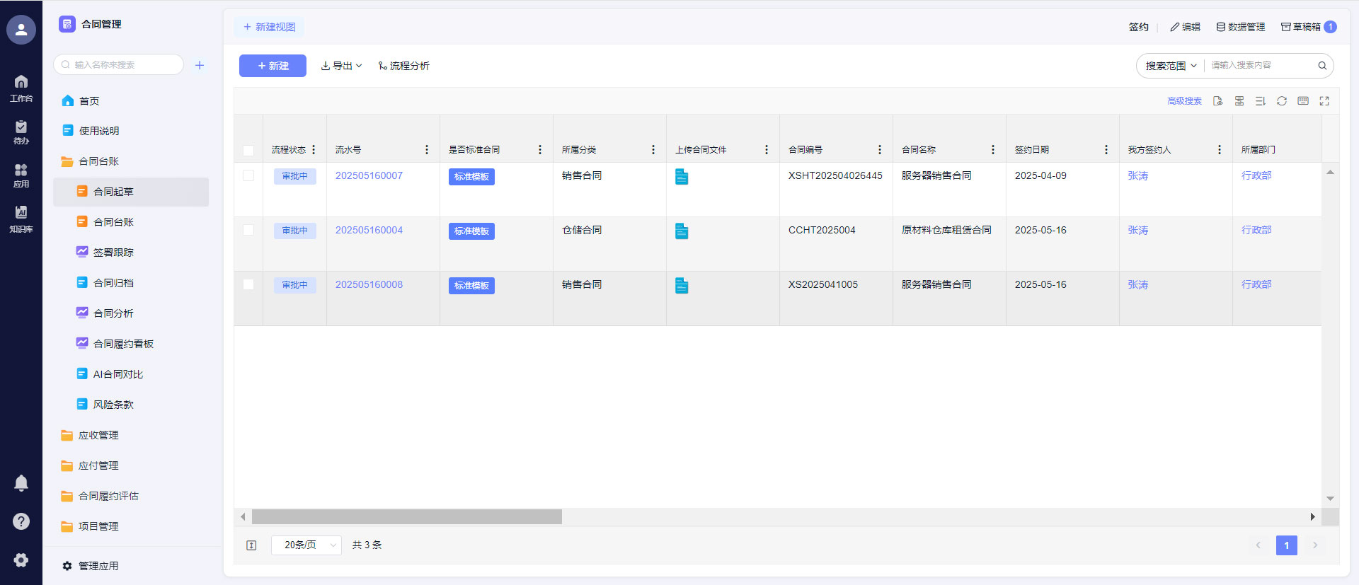起草合同要从零开始,哪怕是相似合同,也要反复复制粘贴修改;审批要线下跑签字,负责人不在就只能等,一份简单的采购合同,审批周期能长达1-2周;签署合同要快递往返,不仅花运费,还容易延误商机;归档后找合同,要翻遍文件柜、翻遍Excel表格,动辄半小时起步。