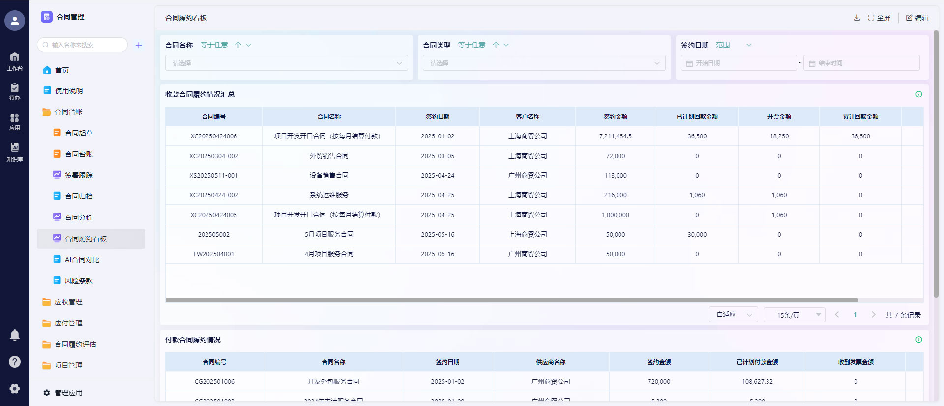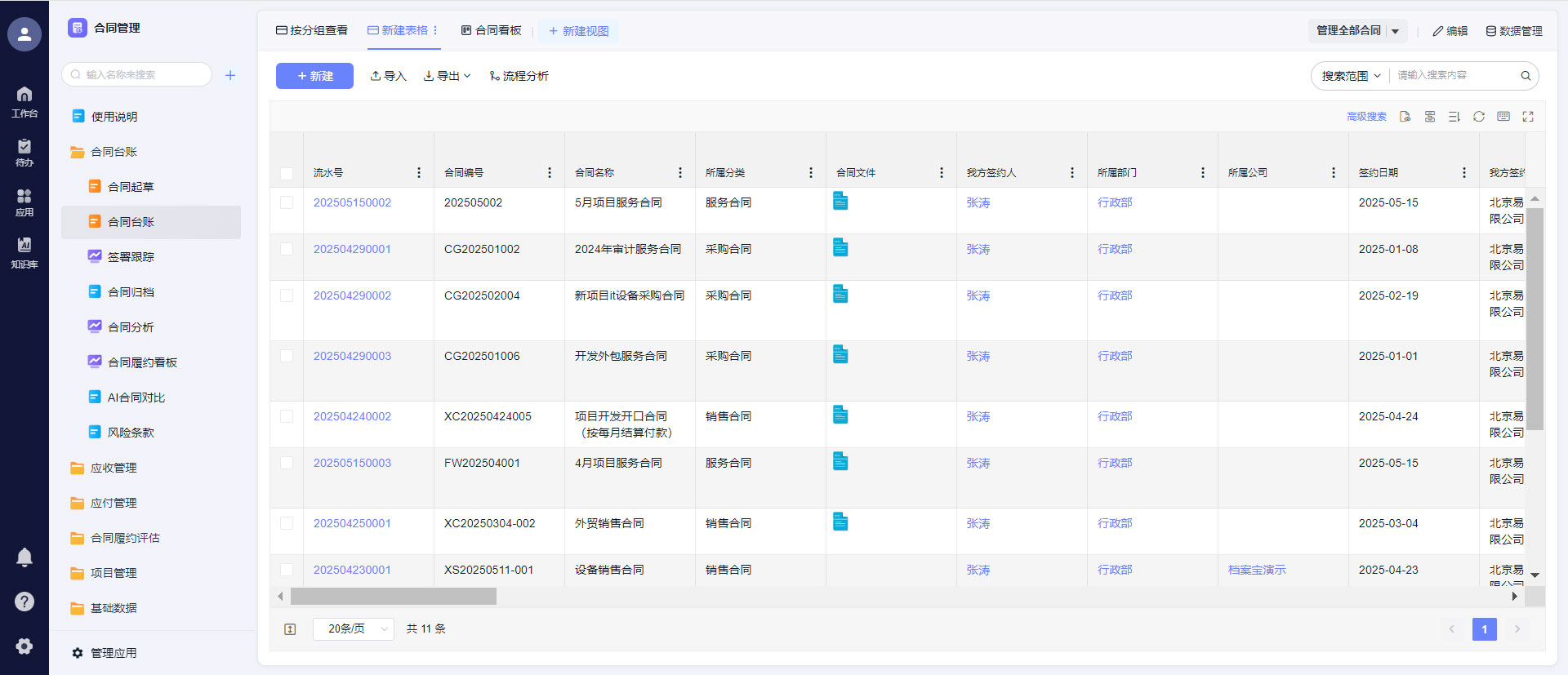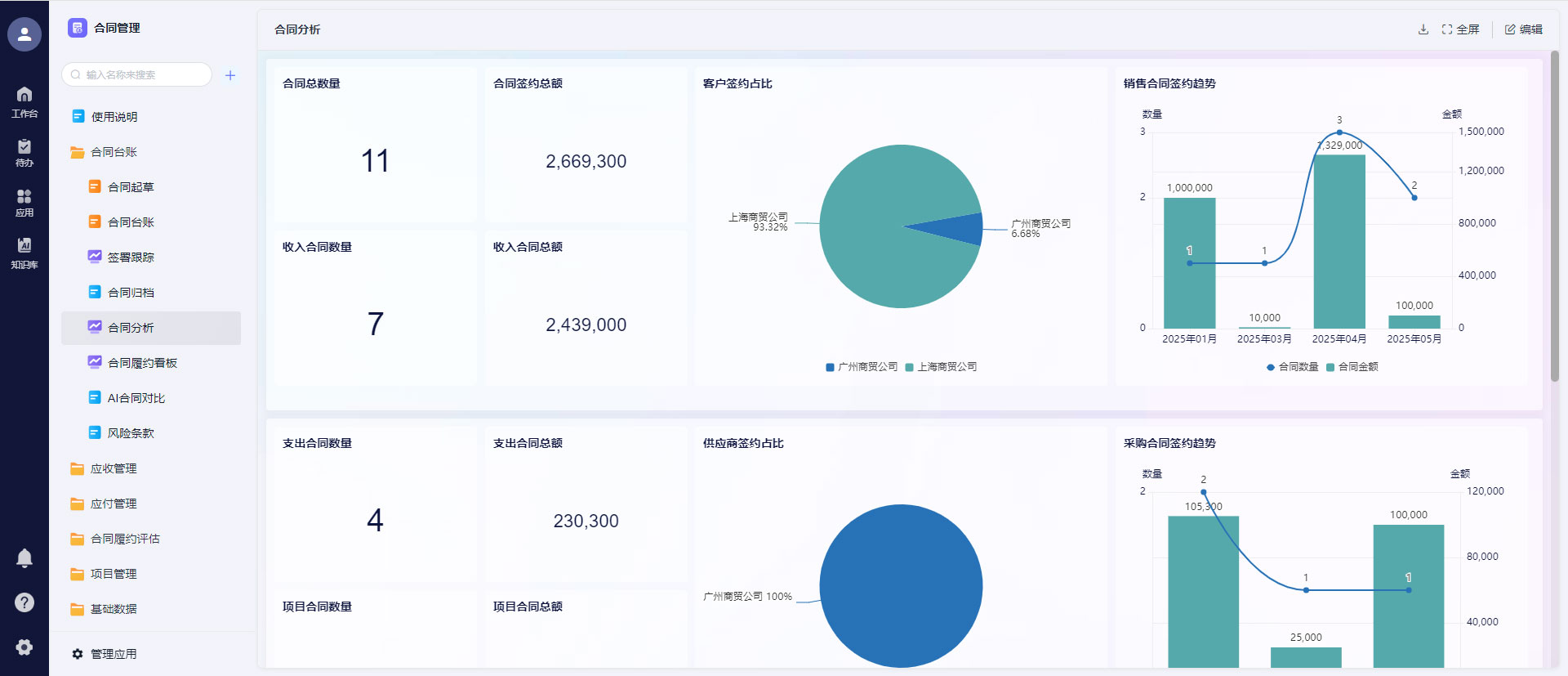 合同数据分散在Excel、文件柜、各部门的电脑里,没有统一的统计和分析,老板想知道“这个季度签了多少合同”“哪些客户回款逾期”“哪些业务线合同收益最高”,只能让员工手动统计,不仅耗时久,数据还容易出错。