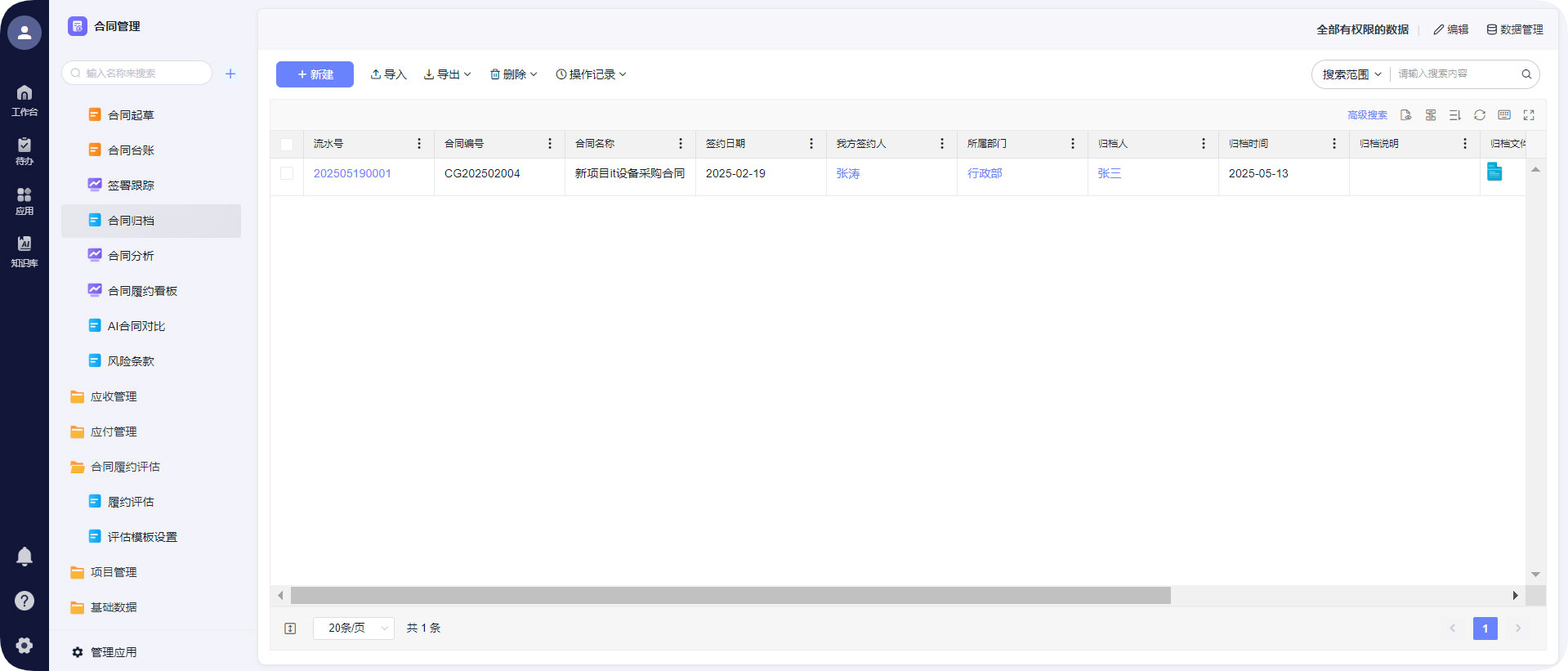 但很多企业的合同管理,还是“东一榔头西一棒子”:纸质合同堆得像山,电子合同散在每个人的电脑里,版本混乱,签字时间、审批记录查不到,归档更是乱七八糟。