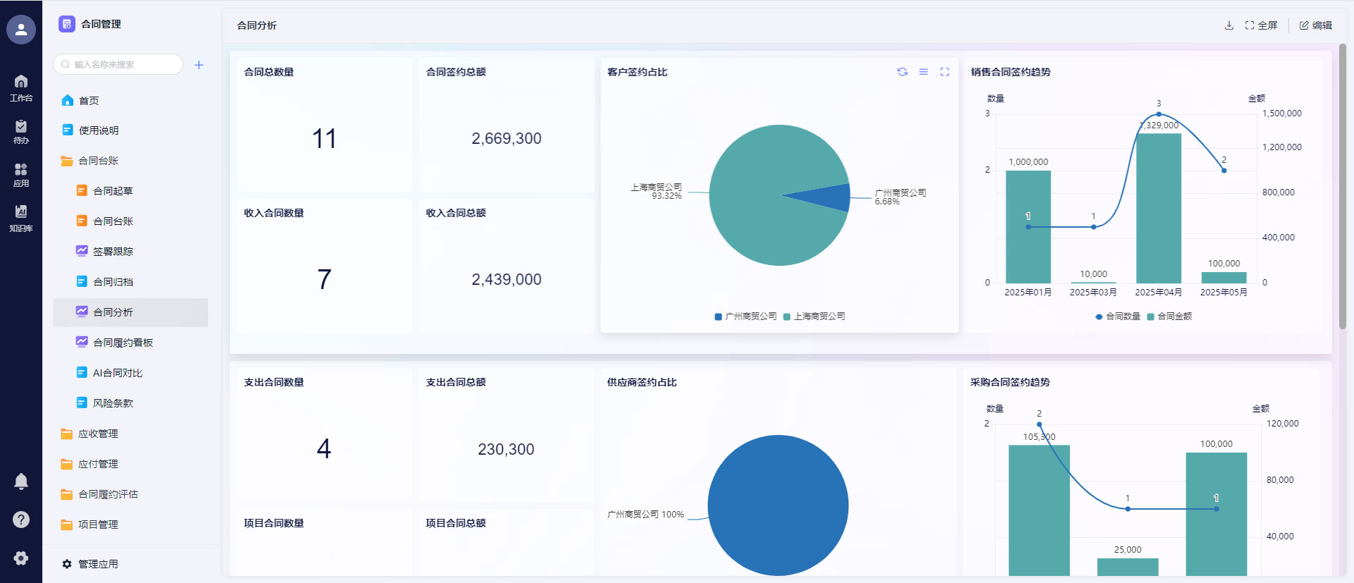 系统自动识别合同异常数据,比如逾期付款、履约滞后、高风险条款、审批超时等,实时推送预警通知;同时基于历史数据,生成合同签约趋势、回款趋势、风险趋势分析。