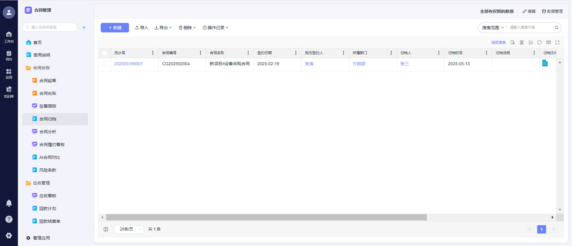 合同分散在销售、法务、财务、行政各个部门,纸质版、电子版混着存,想查一份历史合同,翻箱倒柜几小时;做月度/季度合同统计,得从几十个Excel、几十份文档里手动汇总,数据错漏、重复是常事,统计完半天过去了,数据还不一定准。