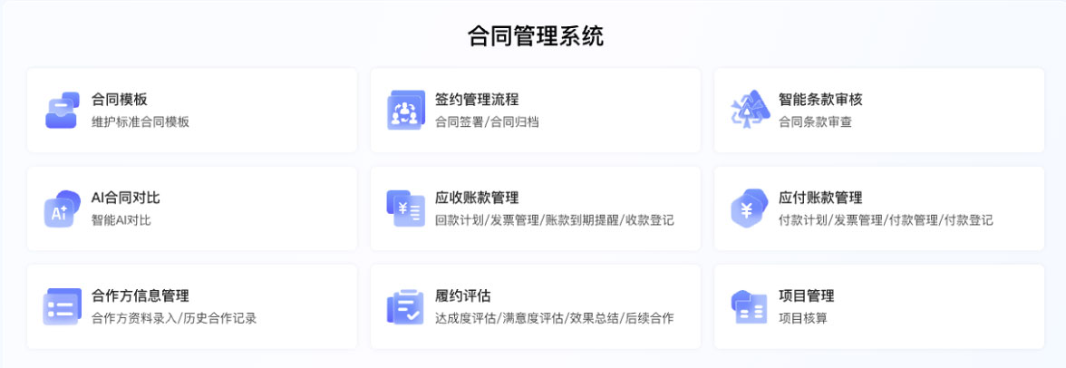 - 自动提取履约节点,到期前15天自动提醒。