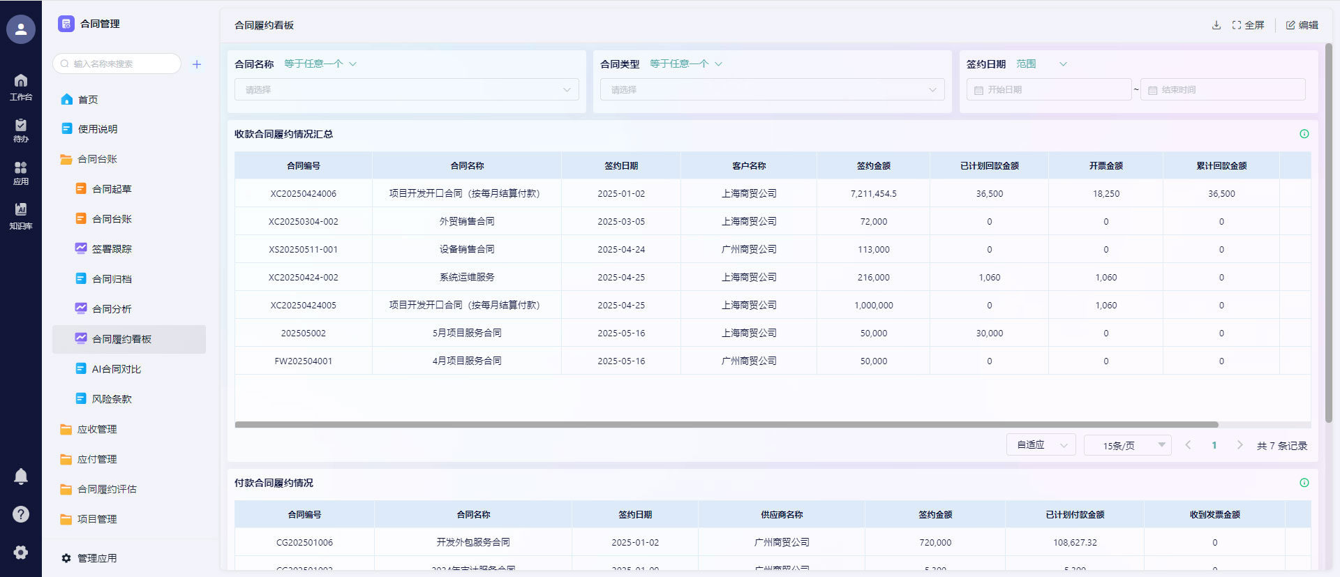 - 数据可视化:生成履约率、逾期率、回款进度等报表,助力企业精准决策。