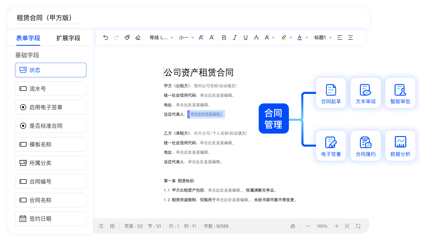 合同创建是整个流程的起点,也是最容易出现效率瓶颈的环节。很多企业因缺乏标准化模板,每次起草合同都要从零开始,不仅耗时久,还容易出现条款遗漏、格式混乱等问题。