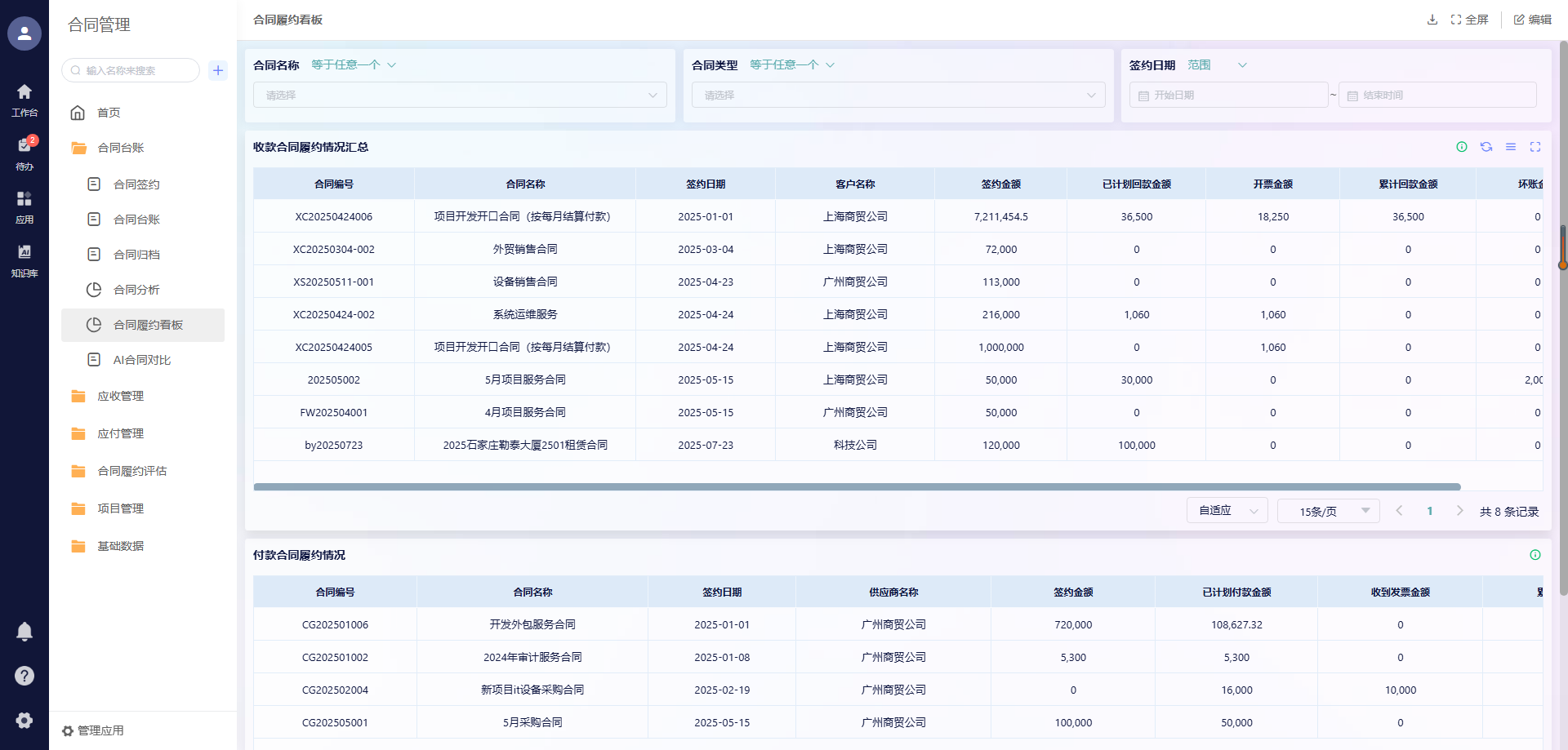 履约进度靠人工跟踪,易出现交付延迟、付款超期;违约风险无法提前预判,只能被动应对 |