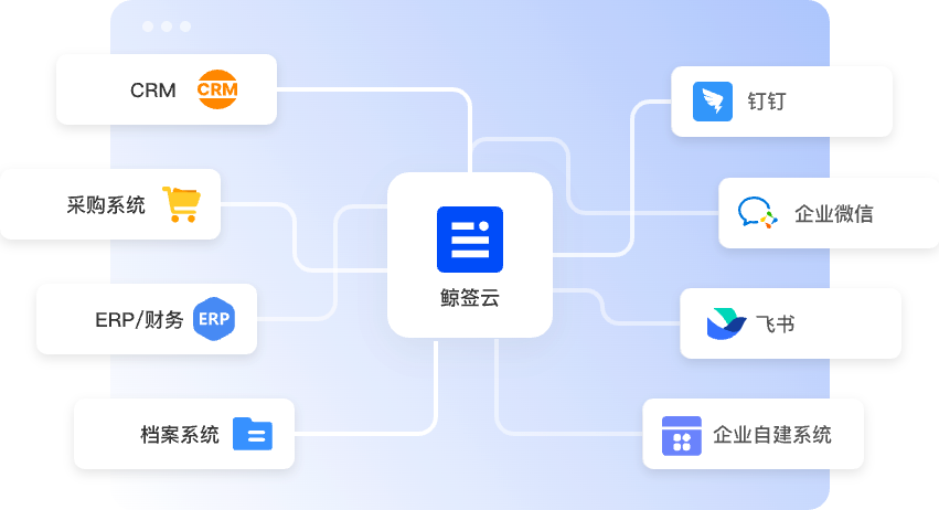 鲸签云功能:专为企业打造的系统对接功能,能直接和企业的 ERP、CRM 等主流系统打通。采购合同的物资信息,自动同步到业务计划;销售合同的金额、付款时间,自动同步到财务对账。不用再跨部门传文件、核对数据,减少人工误差,还能节省大量时间。