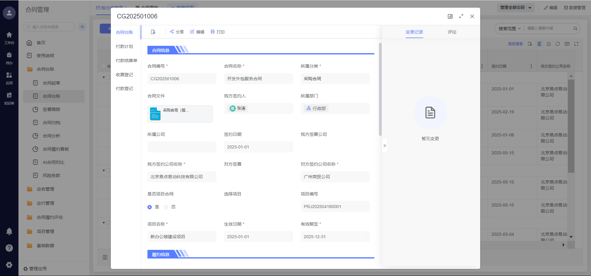 更便捷的是,系统支持关键词一键检索,输入合同名称、合作方、关键条款等任意信息,就能精准找到目标合同,还能同步查看版本、附件、审核记录等相关信息。