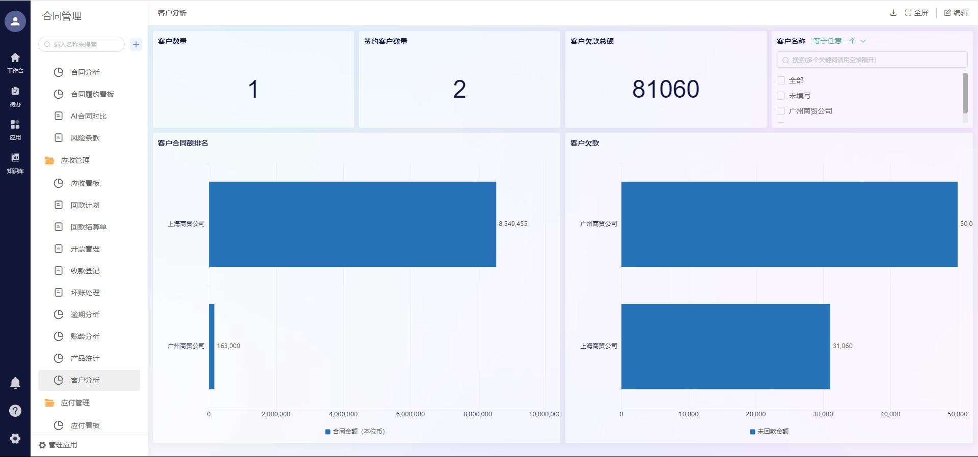对于企业管理者来说,最需要的是清晰的经营数据。鲸签云对接各业务系统后,会把合同数据、财务数据、业务数据整合到一起,生成可视化的合同数据驾驶舱,不管是合同签约金额、履约进度,还是逾期风险、现金流预测,都能实时查看。