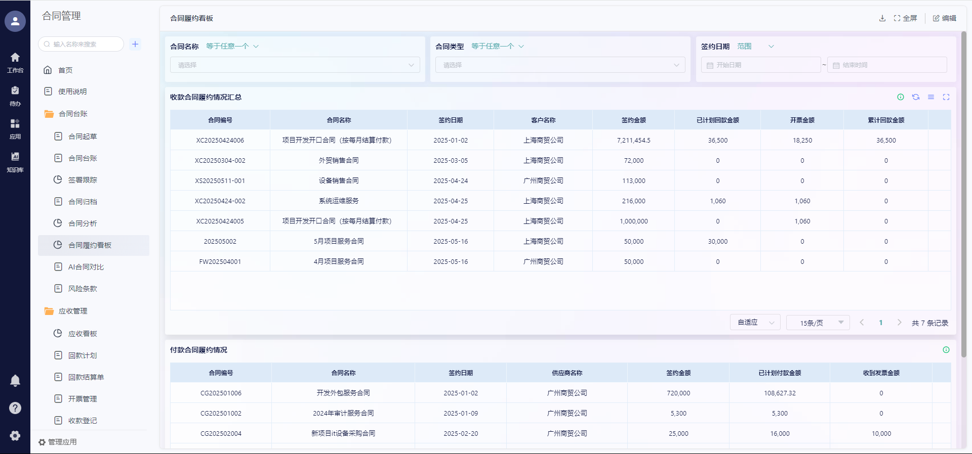 同时,系统还能实时跟踪履约进度,哪项义务没完成、哪个节点有延误,都能直观看到。某制造企业使用后,合同履约准时率从65%提升至98%,回款周期缩短了30%,再也没有因为忘记跟进而造成损失。