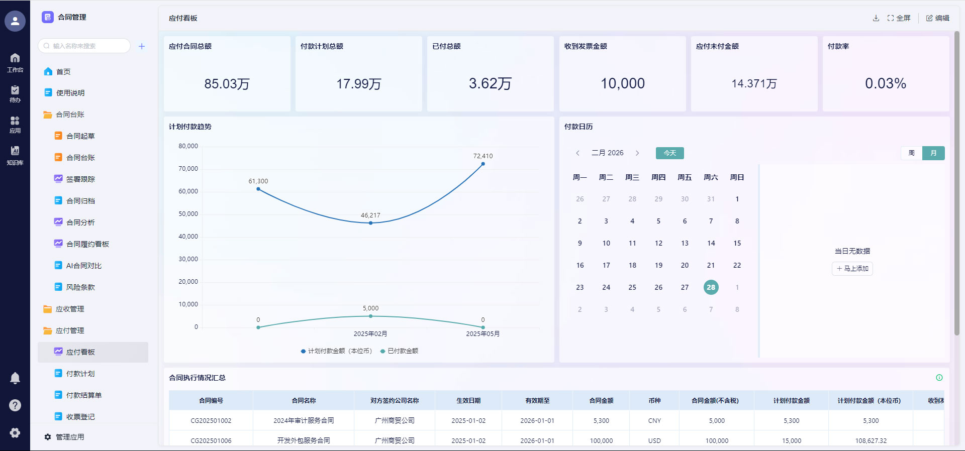 合同金额、付款节点等数据自动同步,无需手动录入,对账时直接调取台账,减少出错概率;付款节点智能提醒,避免逾期付款产生违约金;通过合同数据报表,精准把控资金流向,合理规划资金预算,提升资金使用效率。