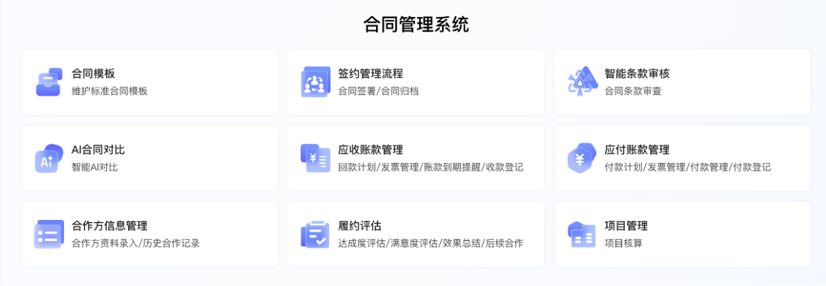 简单说,它就是合同的"专属智能管家",从合同起草的第一个字开始,到最后报废归档,每一步都帮你管得明明白白。不管是合同模板、审批流程,还是履约进度、付款提醒,甚至是合同里的关键数据,都能在系统里一站式搞定。