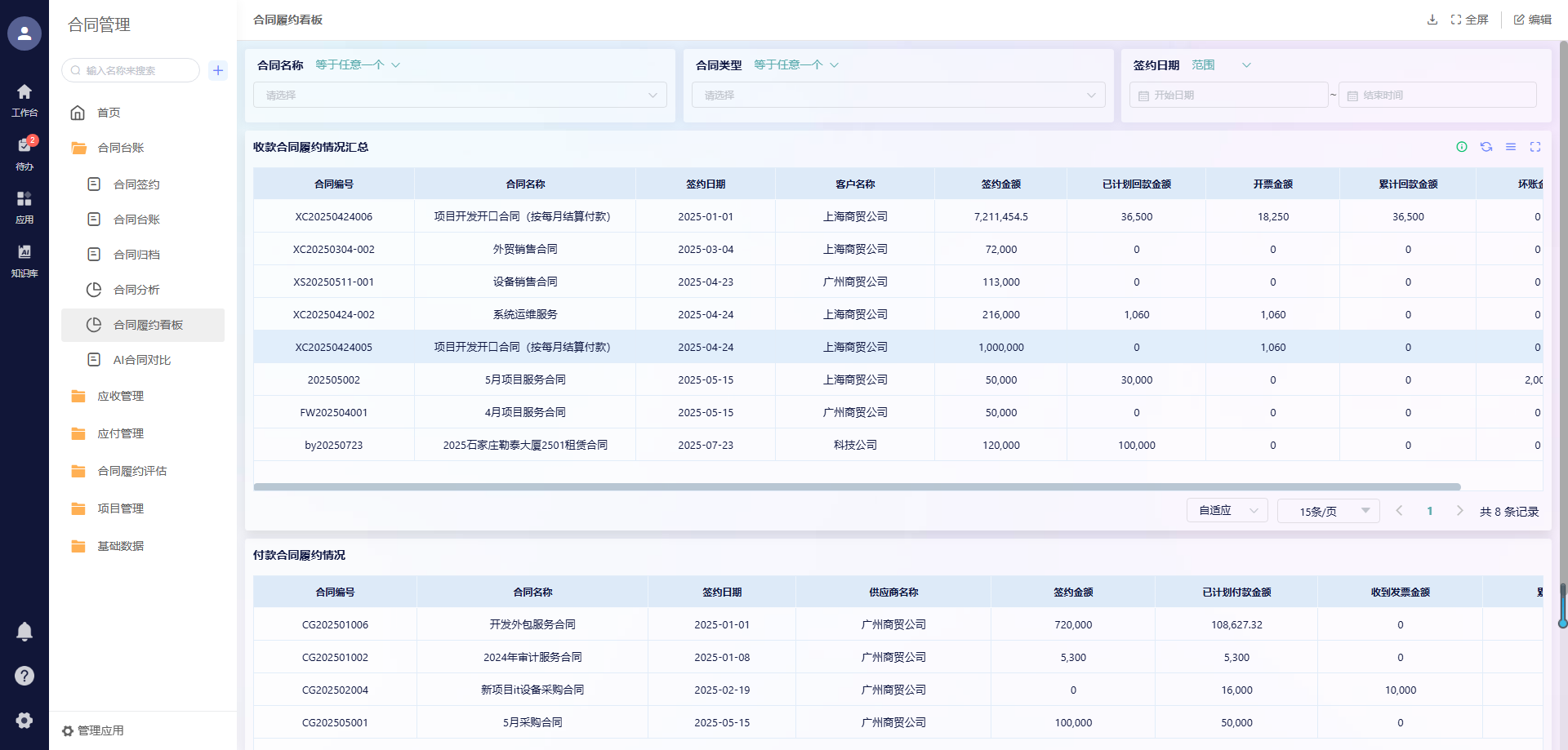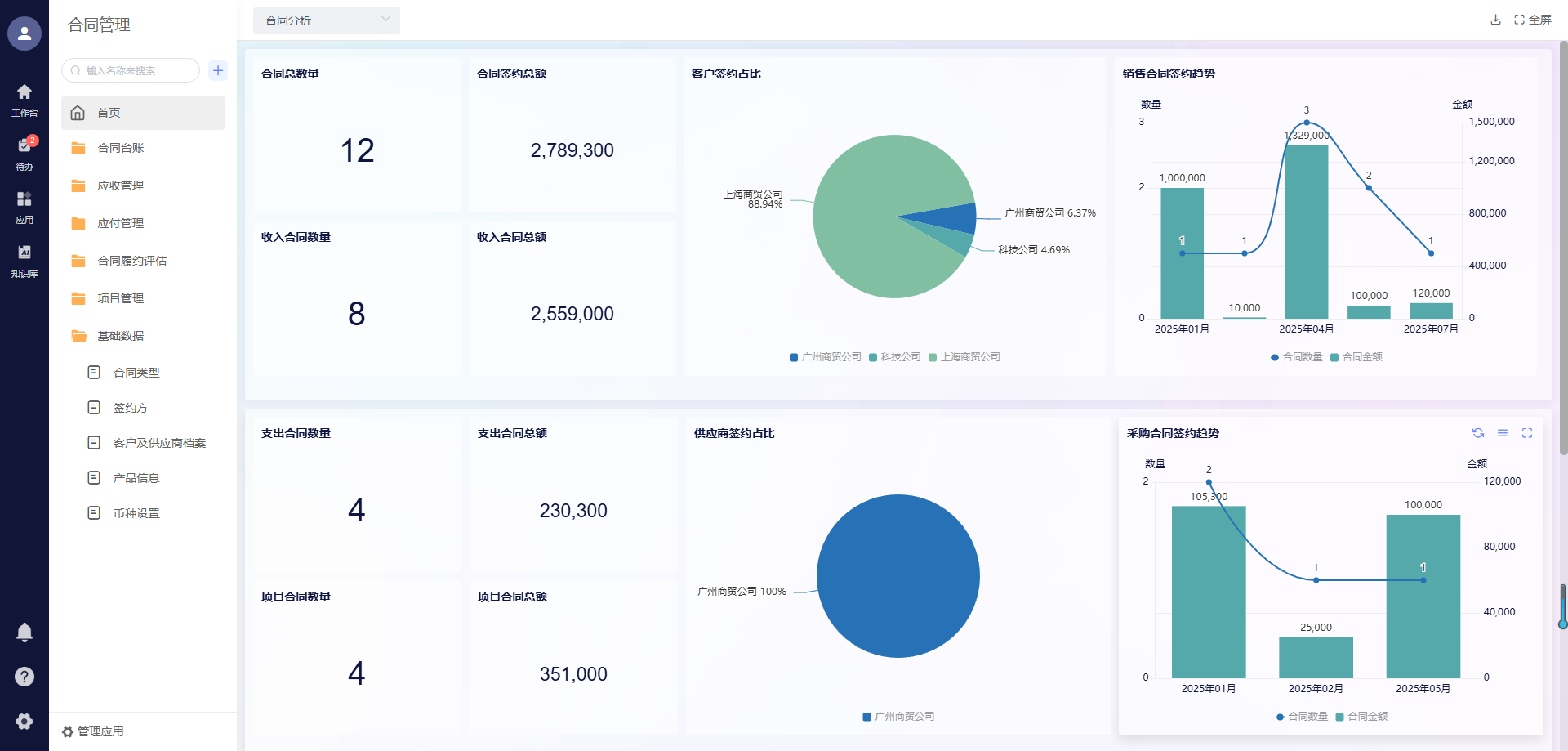 管理者打开鲸签云的合同数据驾驶舱,几十套预置报表一目了然:本月签约量、各项目收款进度、高风险合同有哪些……数据和业务、财务数据直接关联,真实反映企业经营状况。
