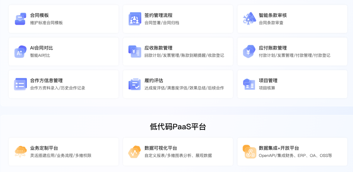 - 支持合同与ERP、CRM系统打通,一键关联发票、订单、项目进度,审计一键调阅;