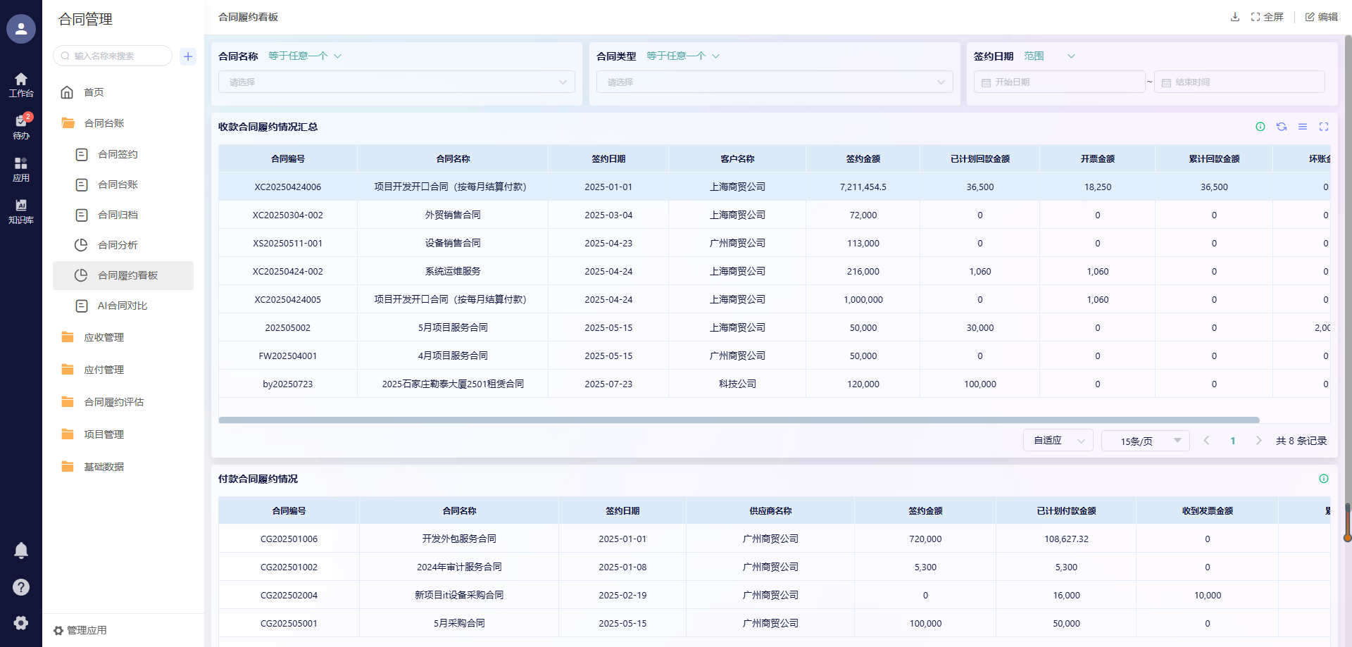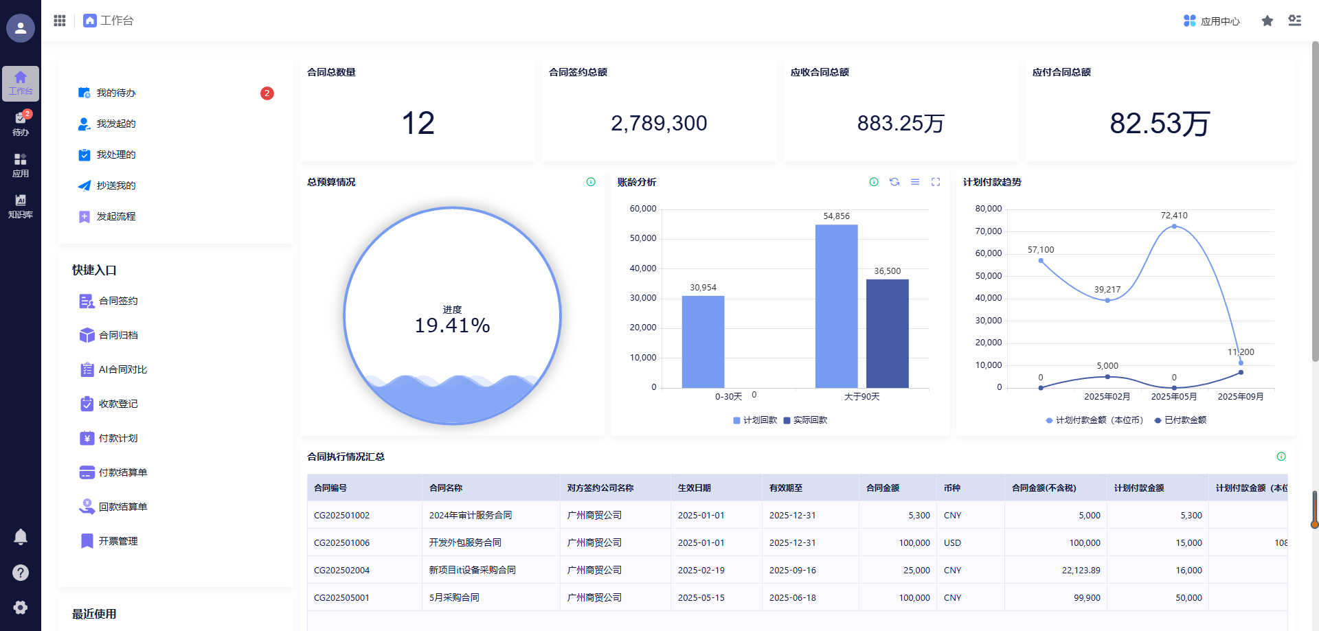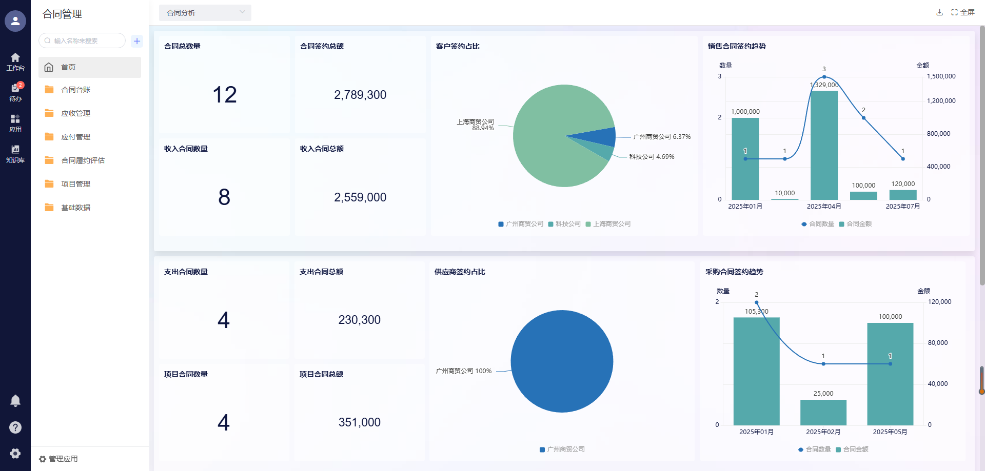 - 自动生成合同数据看板,直观展示合同数量、金额、风险等级、履约情况;