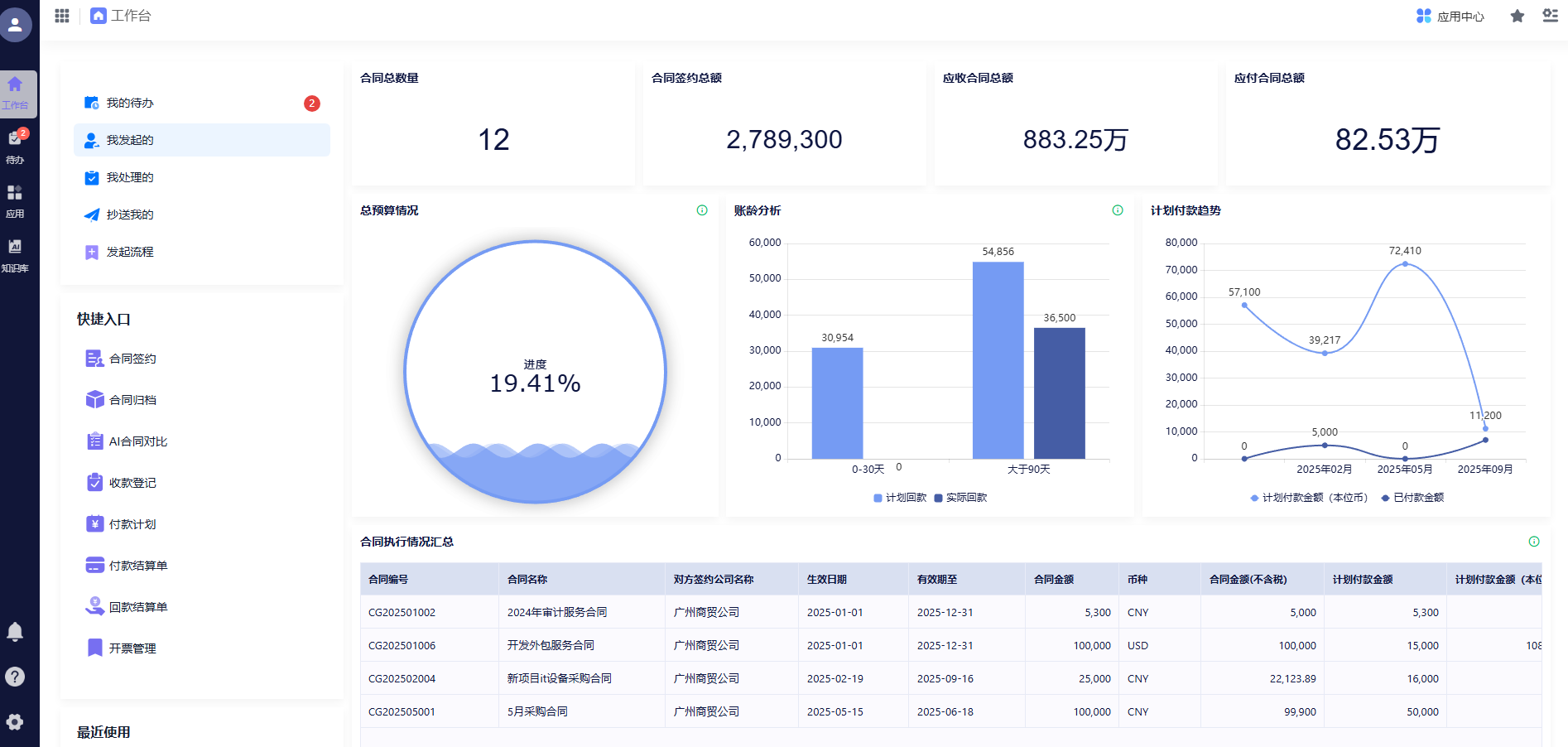 - 合同金额与财务预算实时对照,确保合同费用在预算范围内;