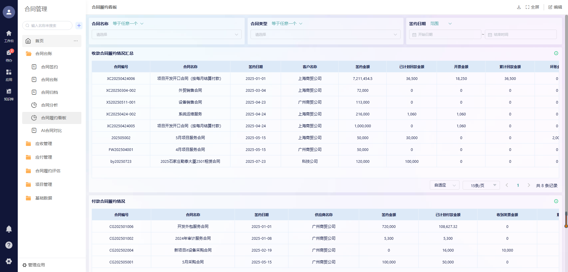 - 合同履约进度跟踪数据,实时掌握合同执行情况;